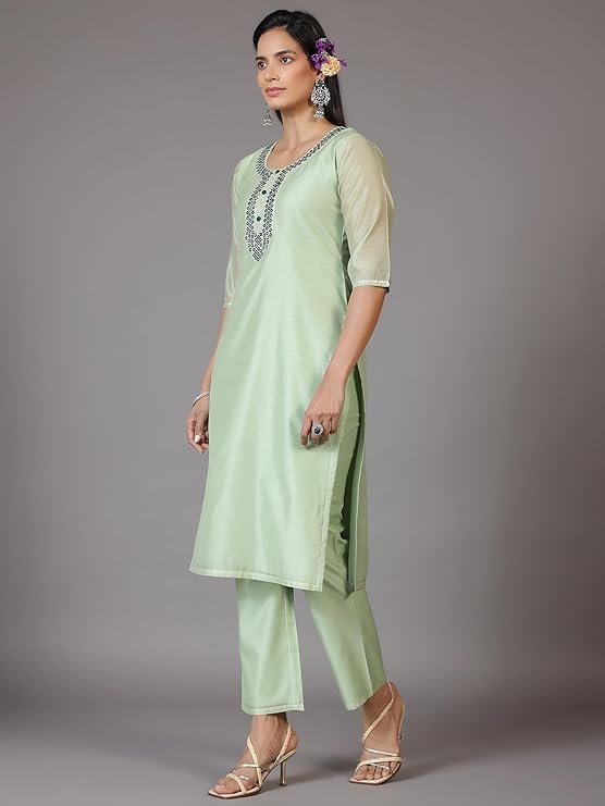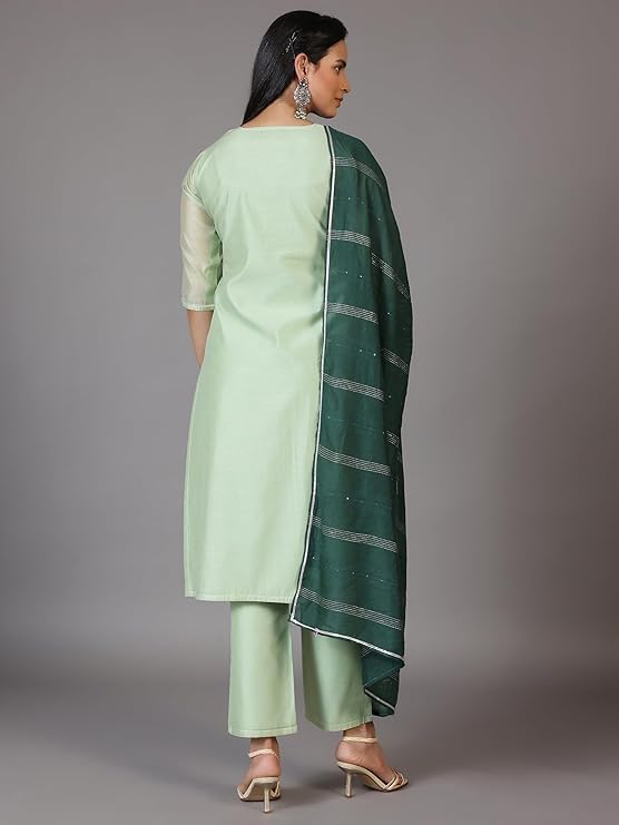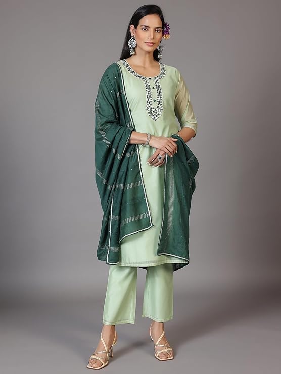 Libas Navy Blue Self Design Silk Blend Straight Kurta With Trousers & Dupatta