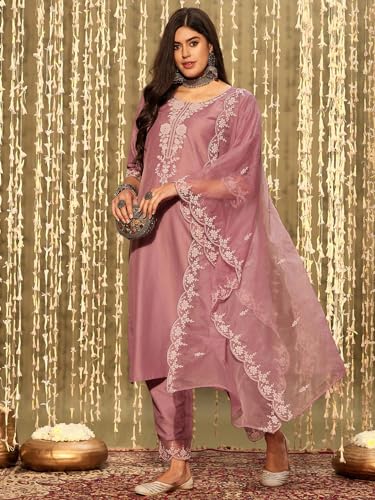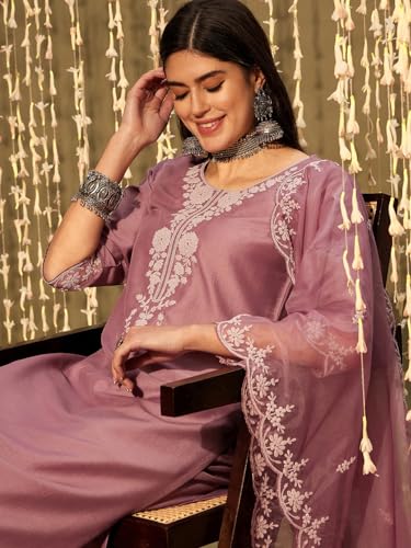 INDO ERA Women's Silk Blend Floral Embroidered A-line Kurta Palazzo with Dupatta Set